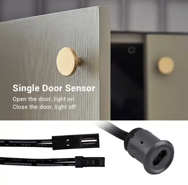 This is a single door LED cabinet sensor for our 24v line of drivers and LED strips. This sensor can be surface mounted or drilled into the edge.